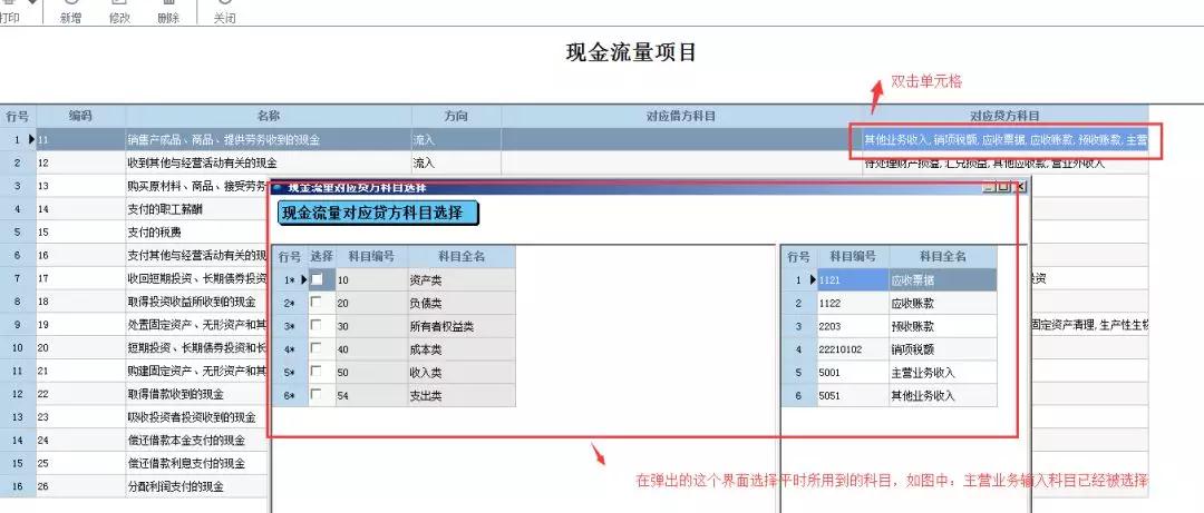 比如,可以在“销售产成品,商品,提供劳务收到的现金”这个是个流入科目,可以在对应贷方科目,设置现金或者银行的对方科目,双击后面对应的单元格就可以添加科目,如图;