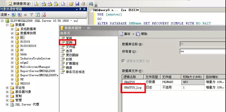 (若不清楚该数据库的日志逻辑文件名称,可以通过下面的方法查询)