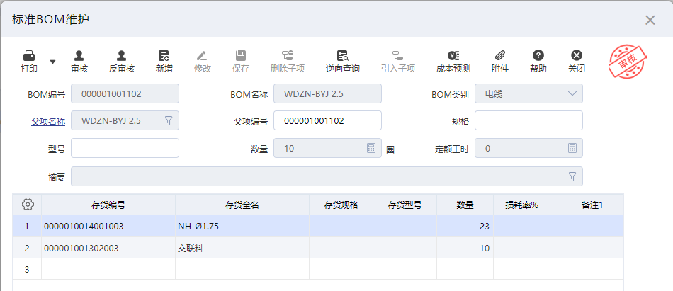 标准BOM也称物料清单,是指产品所需零部件明细及其结构,是由父项存货和子件所组成的产品关系树。物料清单可以是自顶向下分解,或是逆向自底向上跟踪。BOM不仅是MRP系统中重要的输入数据,也是财务部门核算成本,制造部门组织生产等的重要依据。