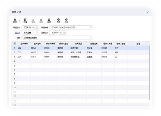 系统中的资产维修记录表,支持对资产的故障情况以及维修情况进行结果记录。