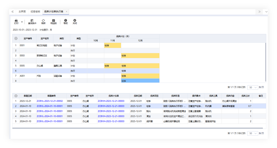 资产保养计划单、保养记录及相应报表可以对企业内部资产定期保养工作进行管理查询。