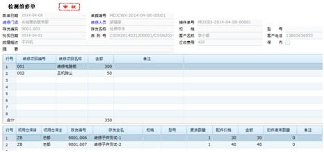 2 、检测维修:在检测维修完成后登记维修所耗材料、维修费用。并可以再次确认是否保修,对于保修内需要返厂的零配件支持缴库管理。