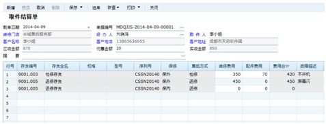 5、取件结算:检修、送修业务在维修完成后需要顾客在前台缴费并领走维修后的商品。保修能的商品系统默认不收取费用(用户可手工填写费用)。